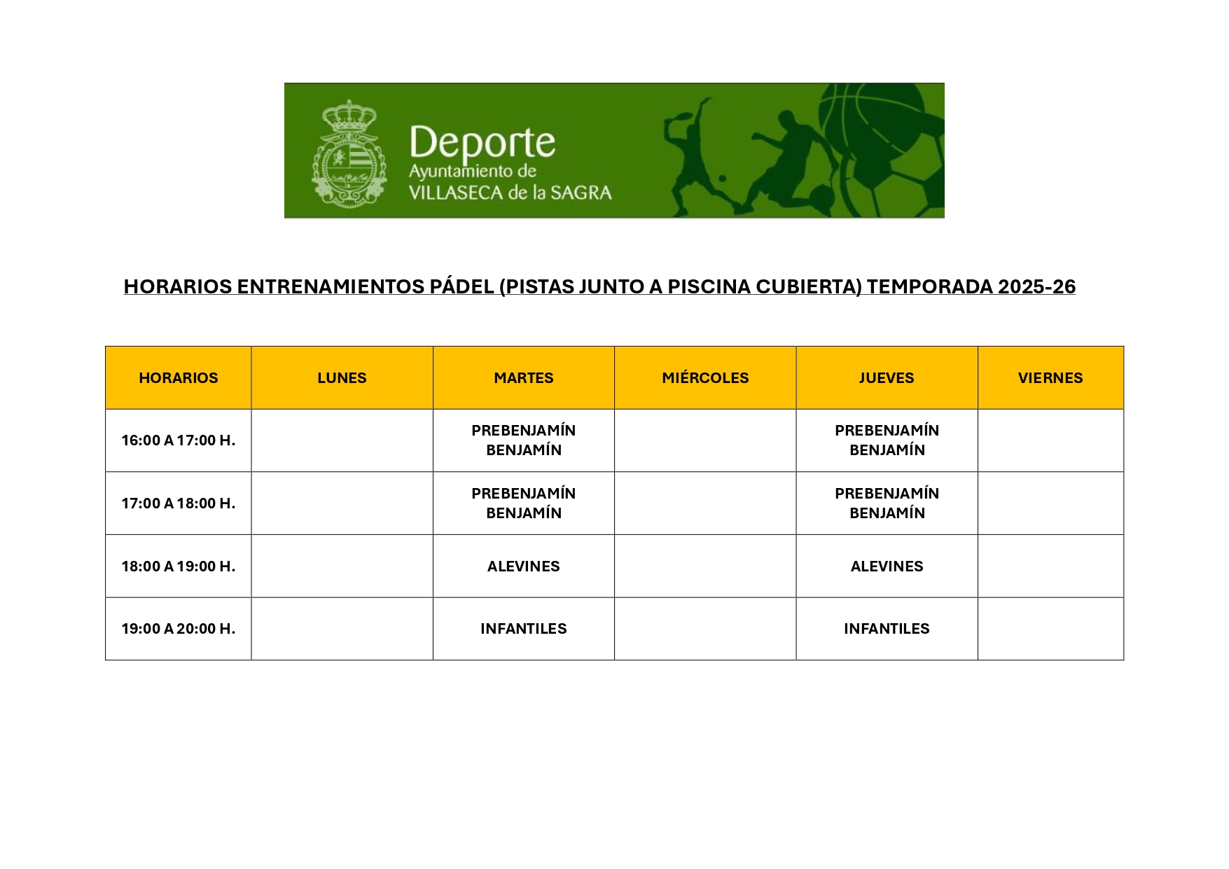 Horarios Actividades Pistas de Pádel 2025/2026