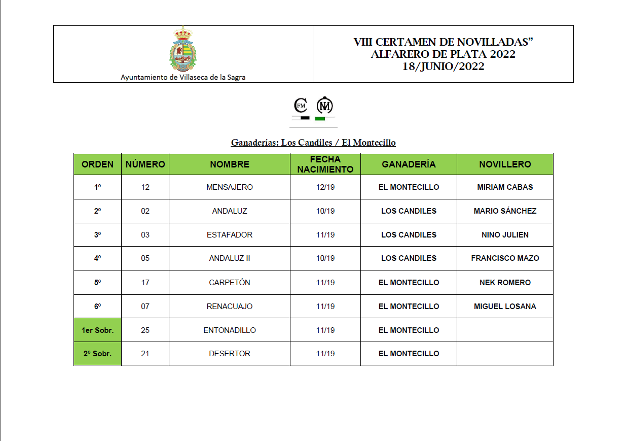 Se lidiaron 6 erales de las ganaderías toledanas, tres de Los Candiles y tres de El Montecillo muy bien presentados y dando todas las opciones para el triunfo de los novilleros en la 3ª novillada clasificatoria del “VIII Certamen Alfarero de Plata 2022”. Destacar el juego del novillo nº 3 de nombre “Estafador” de Los Candiles que fue premiado con la vuelta al ruedo así como los lidiados en cuarto lugar de Los Candiles así como el quinto y sexto de El Montecillo que fueron ovacionados en el arrastre.