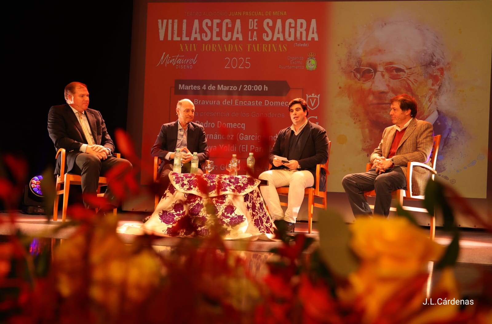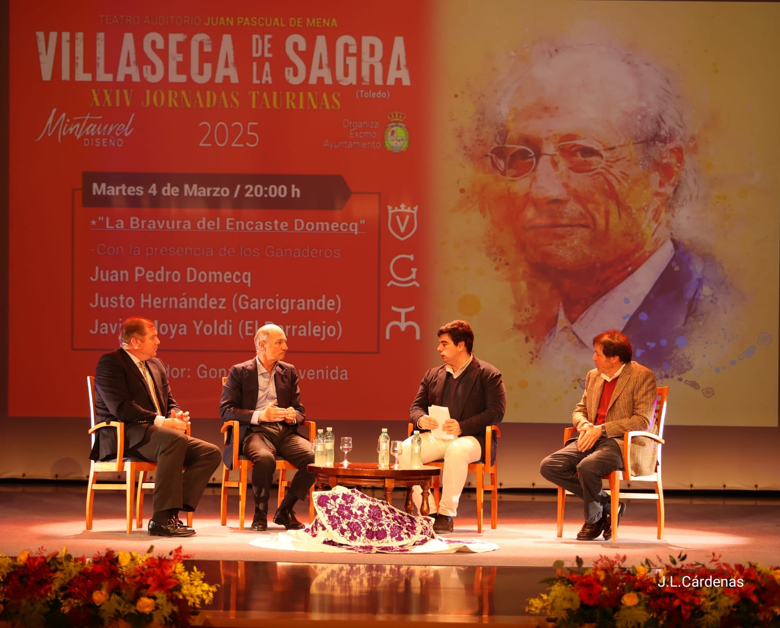 La segunda jornada de las XXIV Jornadas Taurinas de Villaseca de la Sagra ha girado en torno a la bravura y la evolución del encaste Domecq, con la participación de tres destacadas figuras del mundo ganadero: D. José Moya, D. Juan Pedro Domecq Morenés y D. Justo Hernández. La mesa redonda ha sido moderada por el periodista taurino D. Gonzalo Bienvenida.