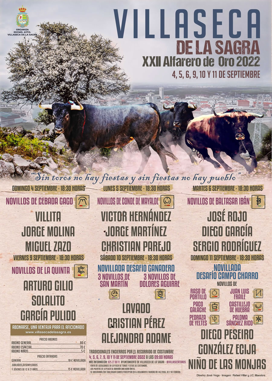 El Ayuntamiento de Villaseca de la Sagra (Toledo) ha presentado los carteles del “XXII CERTAMEN DE NOVILLADAS ALFARERO DE ORO Feria 2022” que se celebrará durante los días 4, 5, 6, 9, 10 y 11 de Septiembre de 2022 con motivo de las Ferias y Fiestas en Honor a “Ntra. Sra. De las Angustias” patrona de la localidad.